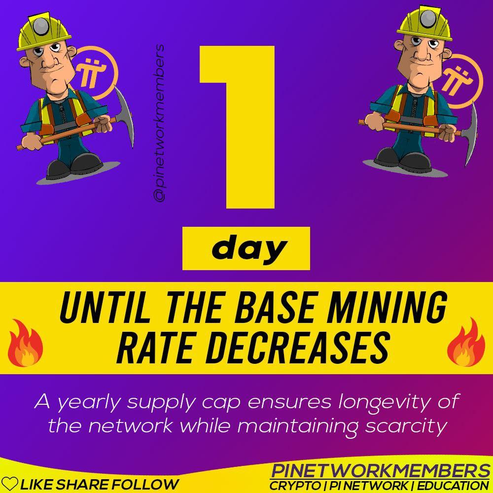 ️? 1 hari sampai tingkat penambangan dasar menuru ✅️ Batas pasokan tahunan memastikan umur panjang jaringan sambil mempertahankan kelangkaan ✅️ Ingatlah bahwa pada 1 November 2022, tingkat penambangan dasar akan menyesuaikan lagi sebagai bagian dari penyesuaian bulanannya berdasarkan formula penerbitan hadiah yang dirilis pada Maret 2022. Mekanisme penambangan baru, efektif 14 Maret, memungkinkan Pionir untuk meningkatkan tingkat penambangan individu mereka melalui beragam kontribusi, termasuk Penguncian Pi, penggunaan Aplikasi, operasi Node, lingkaran keamanan, dan rujukan. ✅️ Tergantung pada batas pasokan tahunan dan jumlah Perintis aktif, tingkat penambangan dasar Pi akan terus menurun setiap bulan, sehingga lebih sulit untuk menambang Pi. ? #pesonapinetwork #bolinggoreload #halving